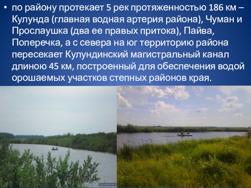 Слайд 5по району протекает 5 рек протяженностью 186 км – Кулунда (главная