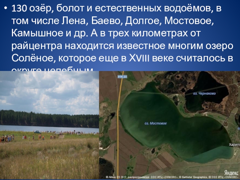130 озёр, болот и естественных водоёмов, в том числе Лена, Баево, Долгое, Мостовое, Камышное и др. А