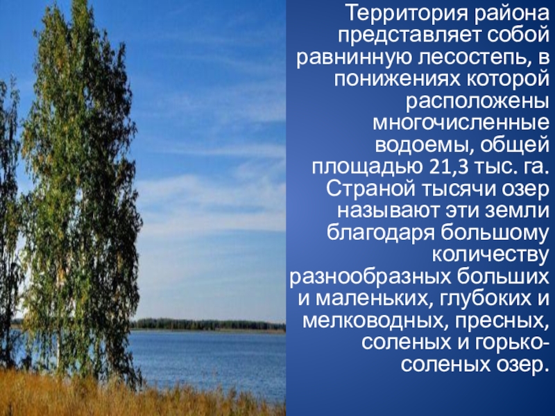 Слайд 3Территория района представляет собой равнинную лесостепь, в понижениях которой расположены многочисленные