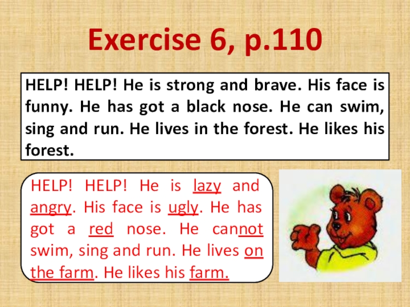 HELP! HELP! He is lazy and angry. His face is ugly. He has got a red nose. He cannot swim, sing and run. He lives on the farm. He likes his farm.