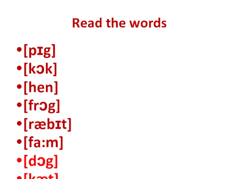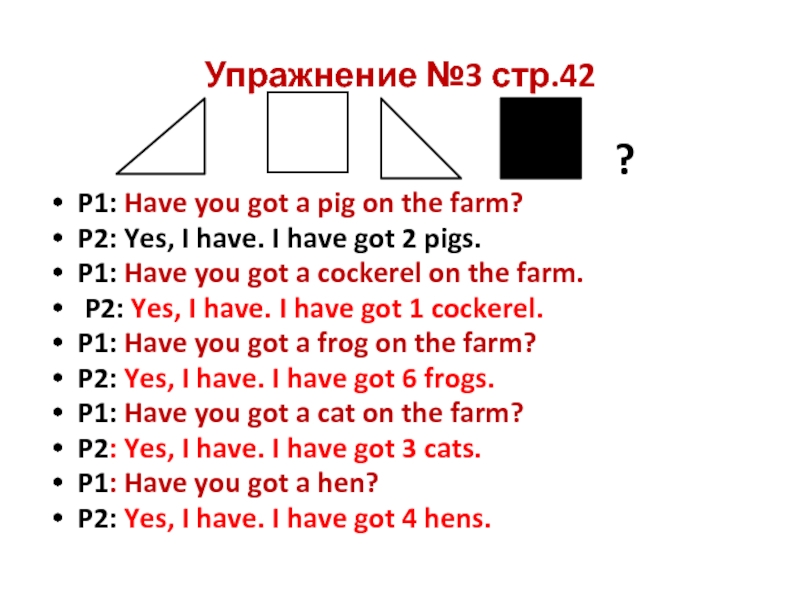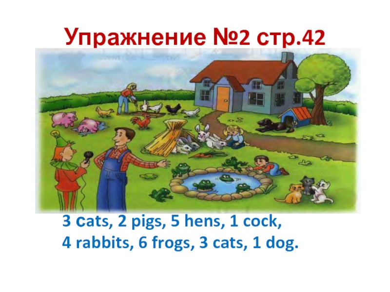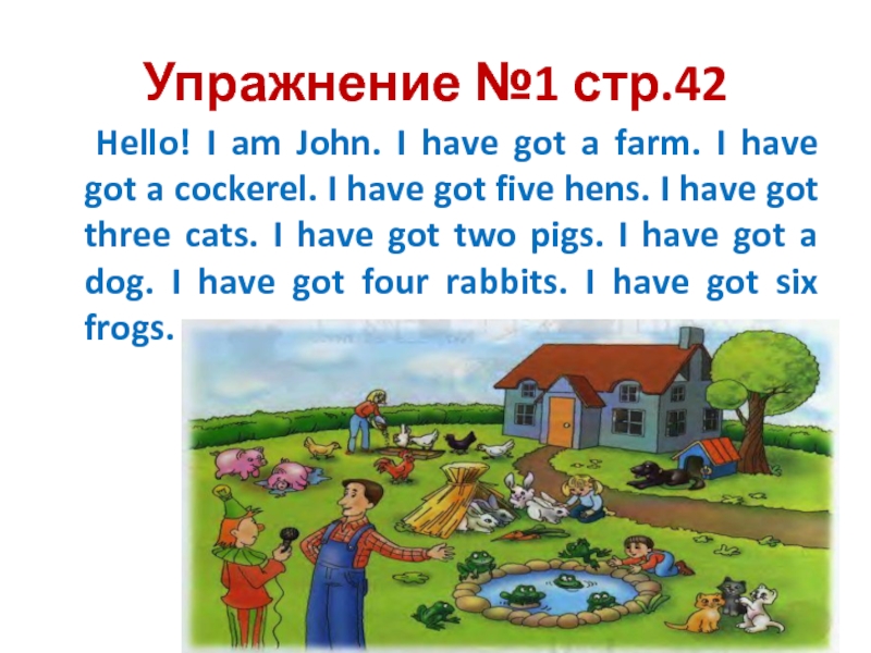 I have got a cockerel. I have got five hens. I have got three cats. I have got two pigs. I have got a dog. I have got four rabbits. I have got six frogs.