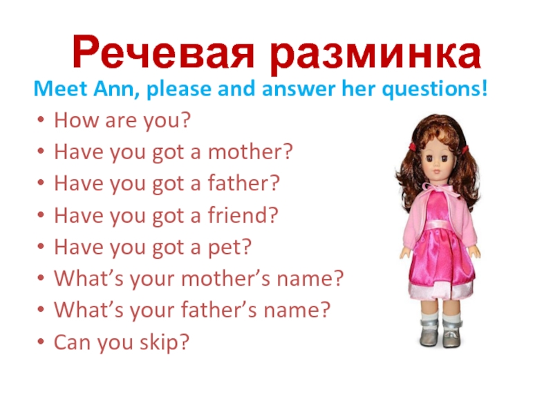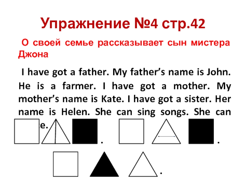 a father. My father’s name is John. He is a farmer. I have got a mother. My mother’s name is Kate. I have got a sister. Her name is Helen. She can sing songs. She can dance.