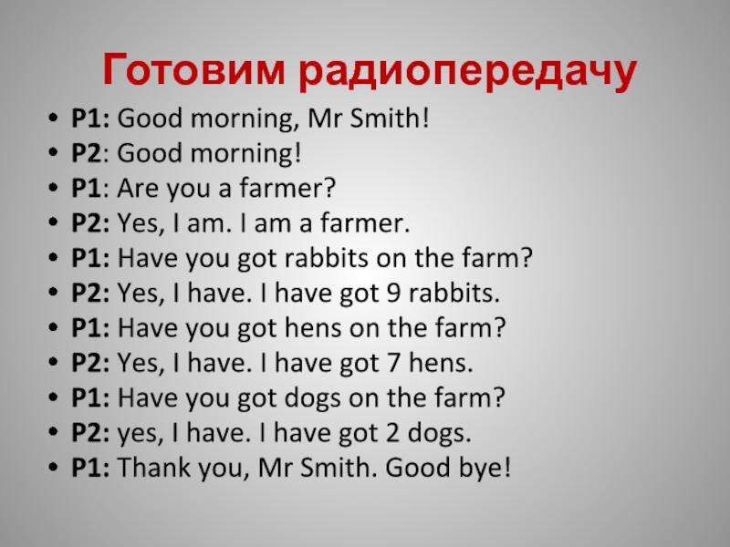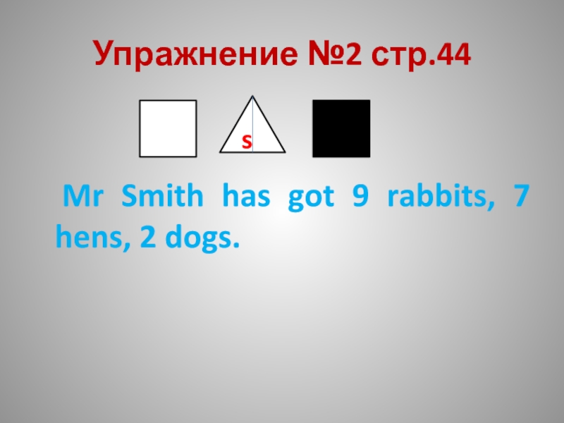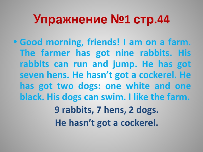 farmer has got nine rabbits. His rabbits can run and jump. He has got seven hens. He hasn’t got a cockerel. He has got two dogs: one white and one black. His dogs can swim. I like the farm.