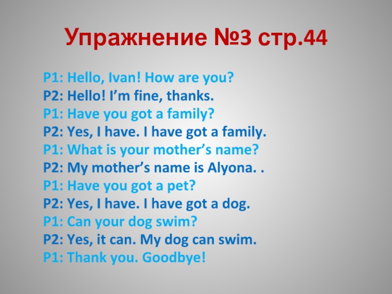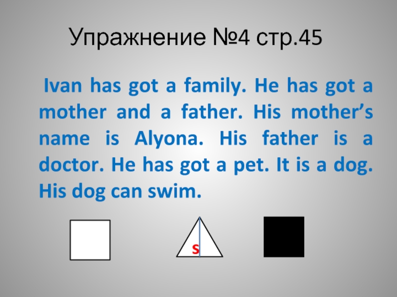 mother and a father. His mother’s name is Alyona. His father is a doctor. He has got a pet. It is a dog. His dog can swim.