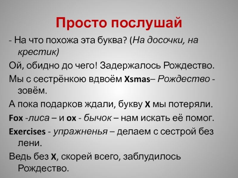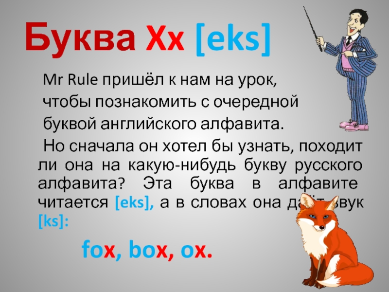 Но сначала он хотел бы узнать, походит ли она на какую-нибудь букву русского алфавита? Эта буква в алфавите читается [eks], а в словах она даёт звук [ks]: