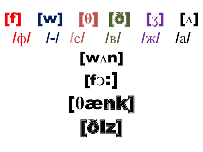 [f] [w] [θ] [ð] [ʒ] [ʌ]/ф/ /-/ /с/ /в/ /ж/ /а/[wʌn][fᴐ:][θænk][ðiz]