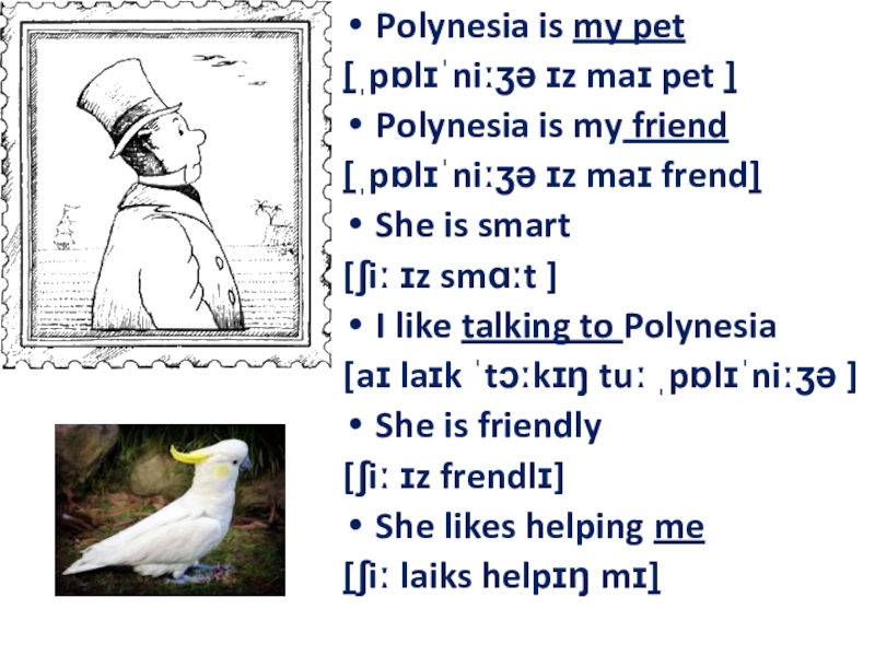 Polynesia is my pet[ˌpɒlɪˈniːʒə ɪz maɪ pet ]Polynesia is my friend[ˌpɒlɪˈniːʒə ɪz maɪ frend]She is smart[ʃiː ɪz smɑːt ]I like talking to Polynesia[aɪ laɪk ˈtɔːkɪŋ tuː ˌpɒlɪˈniːʒə ]She is friendly[ʃiː ɪz frendlɪ]She likes