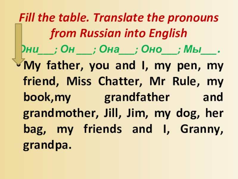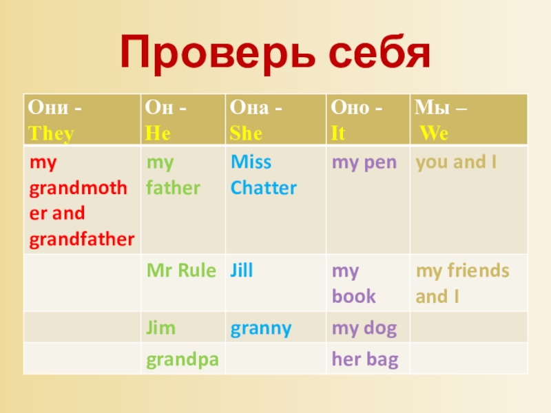 My father, you and I, my pen, my friend, Miss Chatter, Mr Rule, my book,my grandfather and grandmother, Jill, Jim, my dog, her bag, my friends and I, Granny, grandpa.