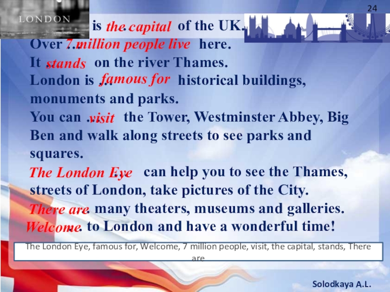 The London Eye, famous for, Welcome, 7 million people, visit, the capital, stands, There are
