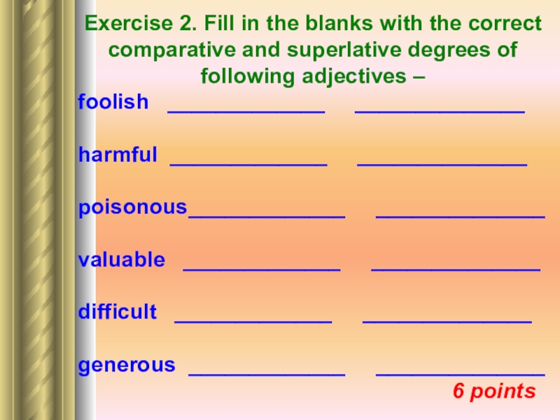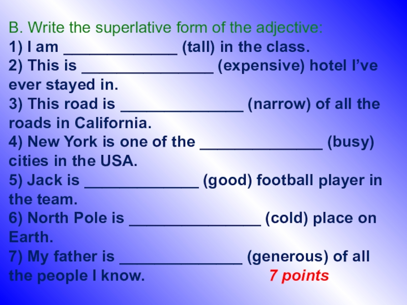 7) My father is ______________ (generous) of all the people I know. 7 points