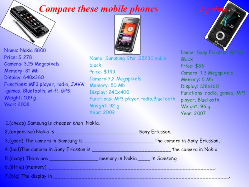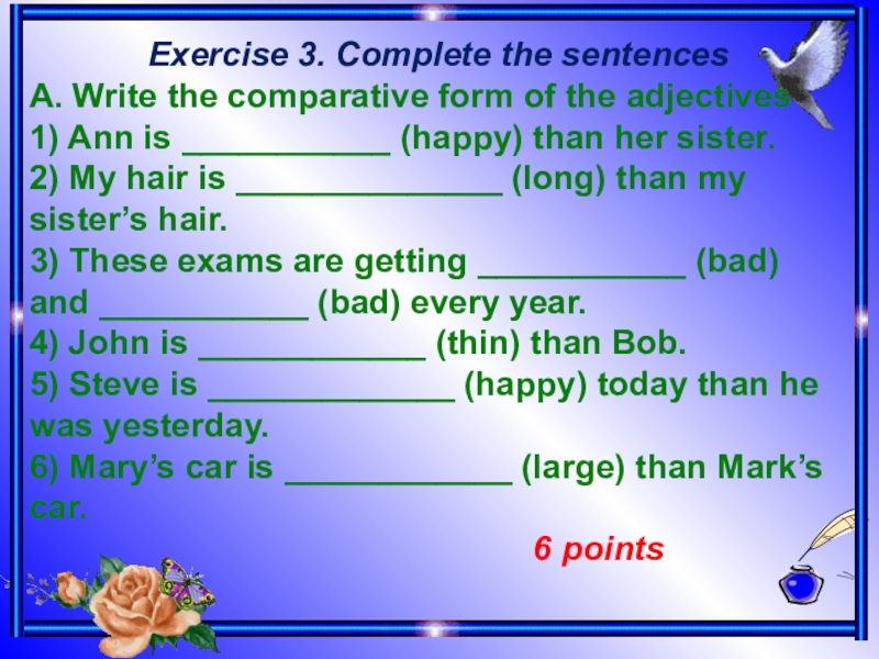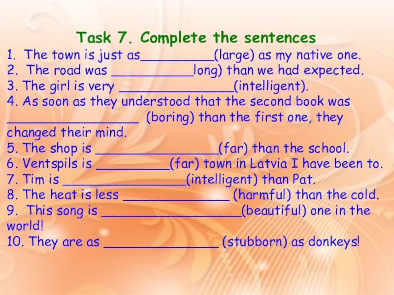 Слайд 7Exercise 2. Fill in the blanks with the correct comparative and