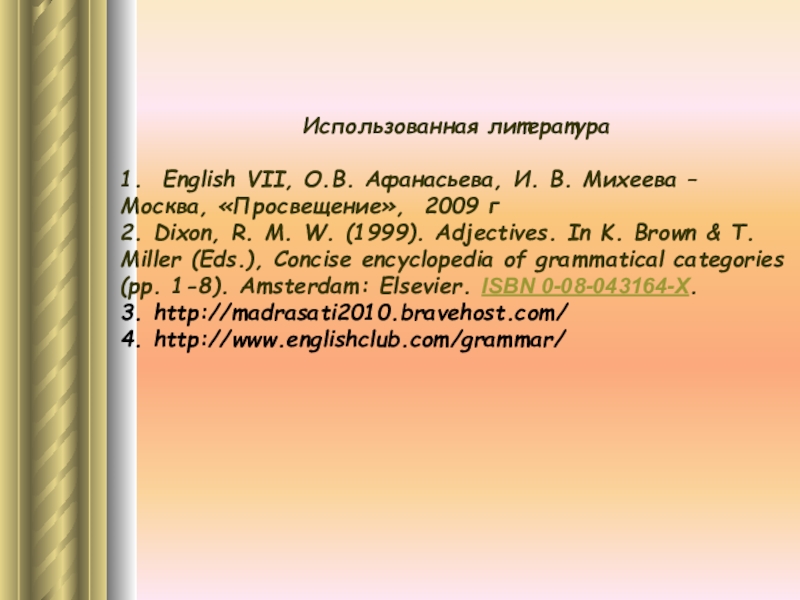 2. Dixon, R. M. W. (1999). Adjectives. In K. Brown & T. Miller (Eds.), Concise encyclopedia of grammatical categories (pp. 1-8). Amsterdam: Elsevier. ISBN 0-08-043164-X.