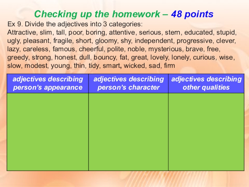 Attractive, slim, tall, poor, boring, attentive, serious, stern, educated, stupid, ugly, pleasant, fragile, short, gloomy, shy, independent, progressive, clever, lazy, careless, famous, cheerful, polite, noble, mysterious, brave, free, greedy, strong, honest, dull, bouncy, fat, great, lovely, lonely, curious, wise, slow, modest, young, thin, tidy, smart, wicked, sad, firm