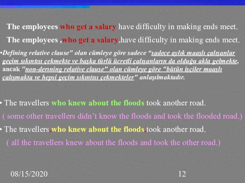 Defining relative clause" olan cümleye göre sadece “sadece aylık maaşlı çalışanlar geçim sıkıntısı çekmekte ve başka türlü ücretli çalışanların da olduğu akla gelmekte, ancak "non-derıning relative clause" olan cümleye göre "bütün işçiler maaşlı çalışmakta ve hepsi geçim sıkıntısı çekmekteler" anlaşılmaktadır.