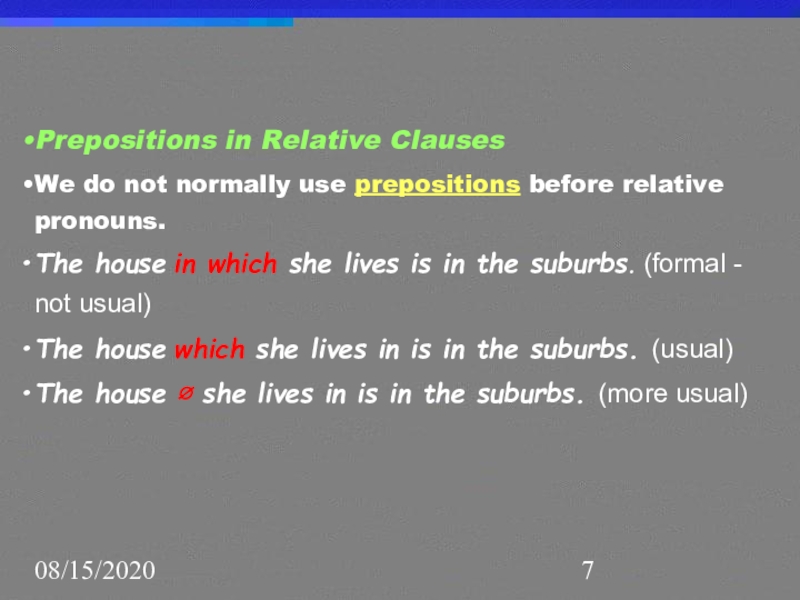 The house which she lives in is in the suburbs. (usual)