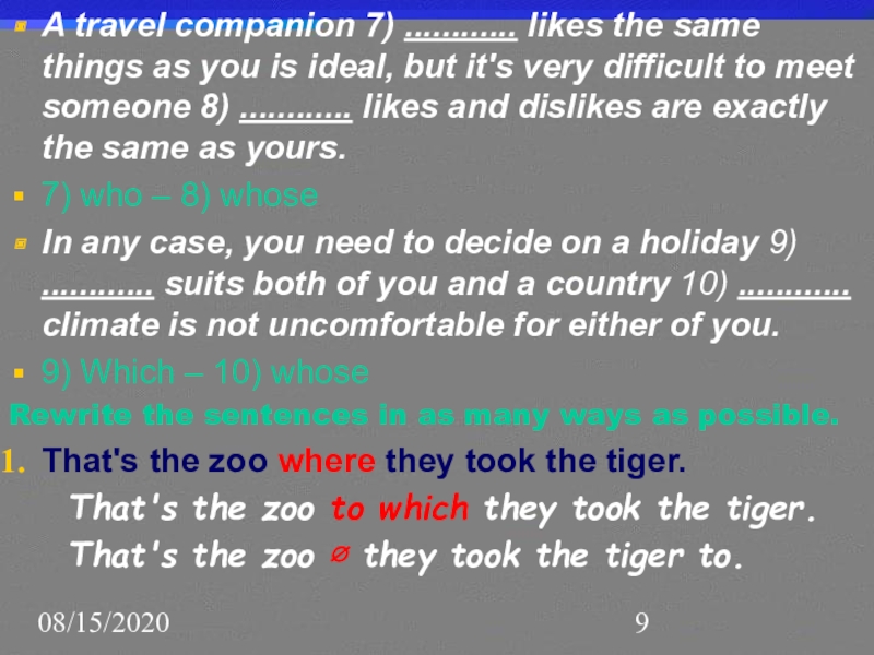 In any case, you need to decide on a holiday 9) ............ suits both of you and a country 10) ............ climate is not uncomfortable for either of you.