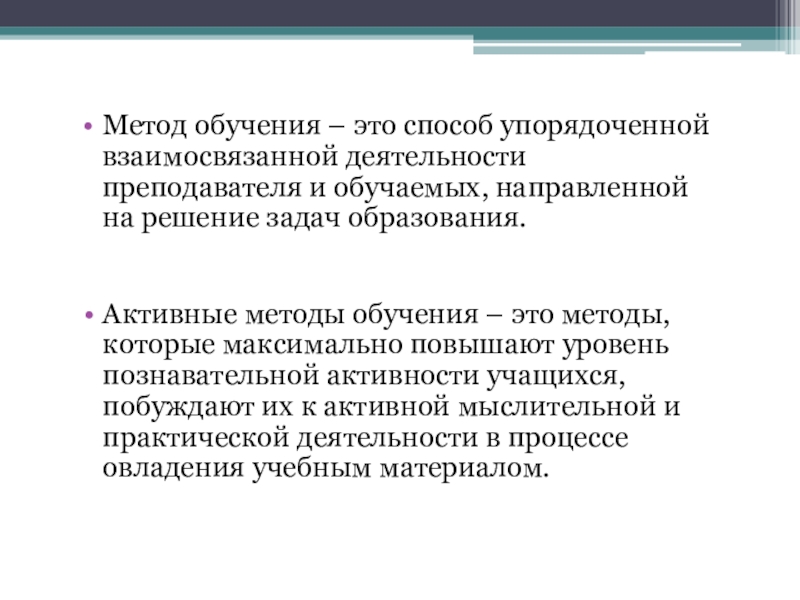 Метод обучения – это способ упорядоченной взаимосвязанной деятельности преподавателя и обучаемых, направленной на решение задач образования.