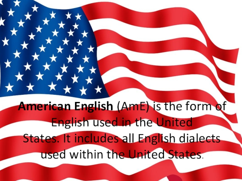 Слайд 4American English (AmE) is the form of English used in the United States. It includes all English dialects  used within the United States.
