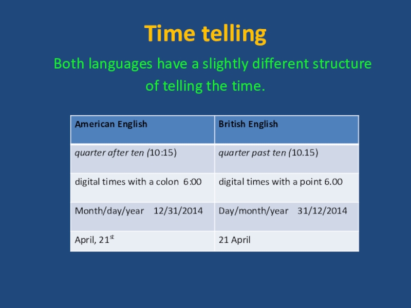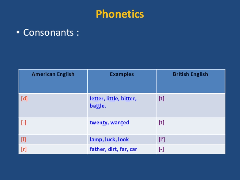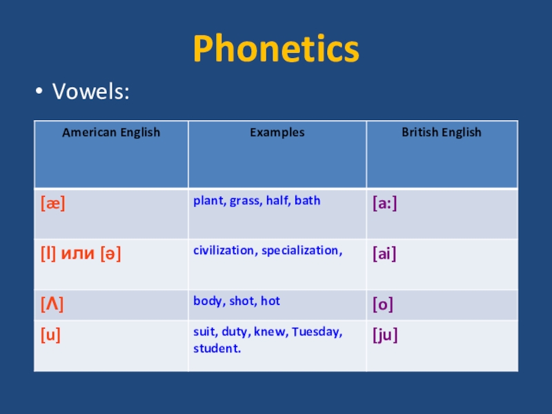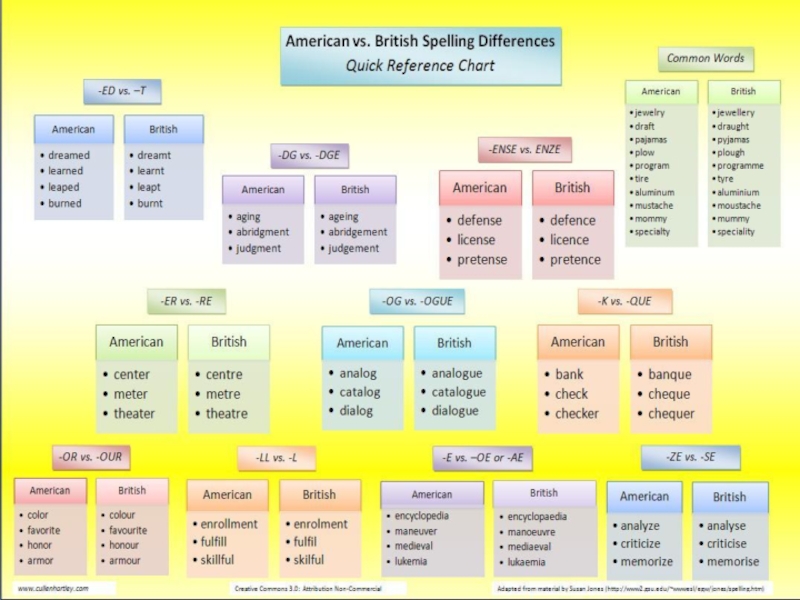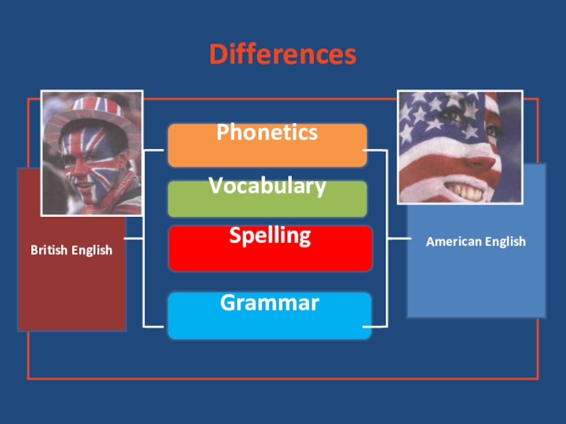 DifferencesBritish EnglishAmerican EnglishPhoneticsVocabularySpellingGrammar