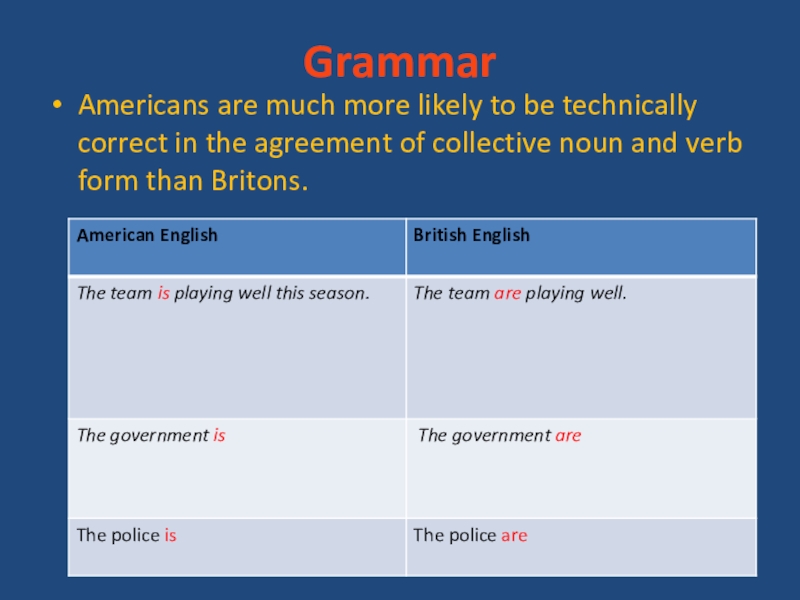 GrammarAmericans are much more likely to be technically correct in the agreement of collective noun and verb