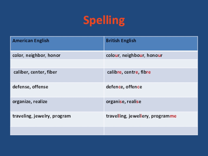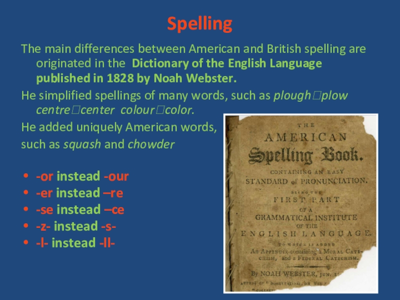 Spelling The main differences between American and British spelling are originated in the Dictionary of the English