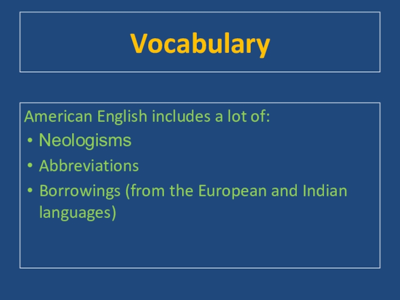 VocabularyAmerican English includes a lot of:NeologismsAbbreviationsBorrowings (from the European and Indian languages)