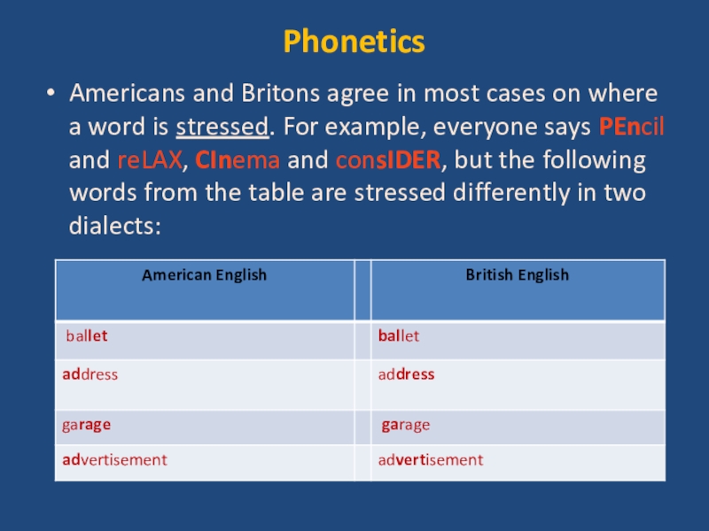 Phonetics  Americans and Britons agree in most cases on where a word is stressed. For example,