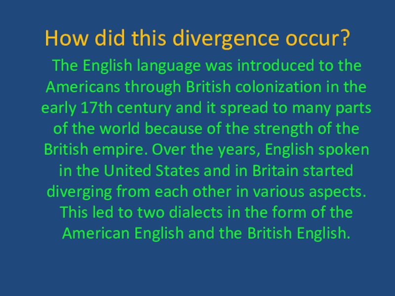 to the Americans through British colonization in the early 17th century and it spread to many parts of the world because of the strength of the British empire. Over the years, English spoken in the United States and in Britain started diverging from each other in various aspects. This led to two dialects in the form of the American English and the British English.