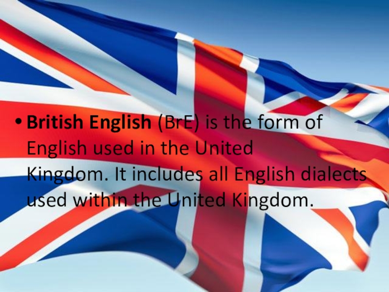 British English (BrE) is the form of     English used in the United Kingdom. It includes all English dialects used within the United Kingdom.