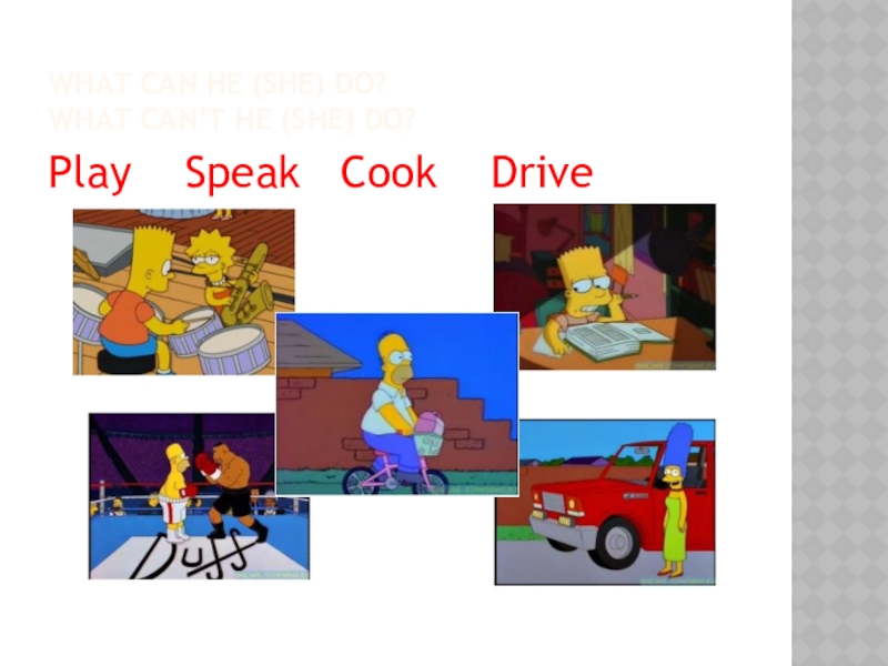 What can he (she) do? What can’t he (she) do?Play  Speak  Cook  Drive