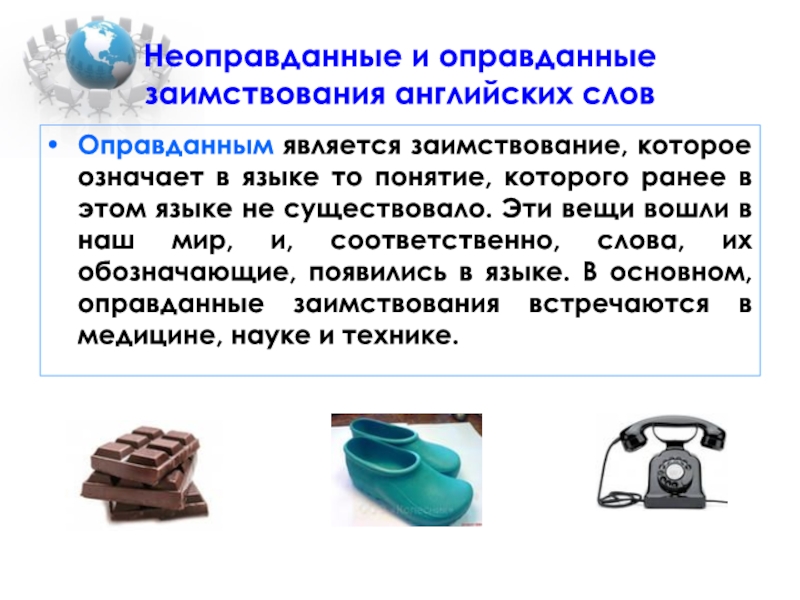 языке то понятие, которого ранее в этом языке не существовало. Эти вещи вошли в наш мир, и, соответственно, слова, их обозначающие, появились в языке. В основном, оправданные заимствования встречаются в медицине, науке и технике.