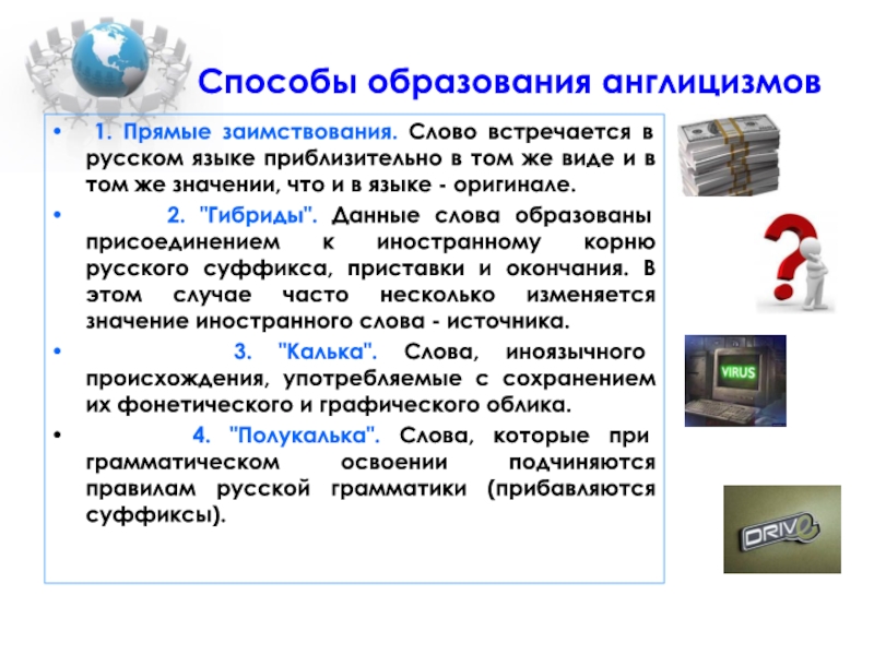 4. "Полукалька". Слова, которые при грамматическом освоении подчиняются правилам русской грамматики (прибавляются суффиксы).