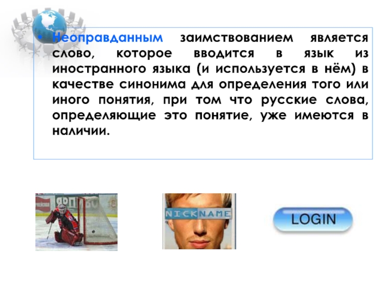 Слайд 10Неоправданным заимствованием является слово, которое вводится в язык из иностранного языка