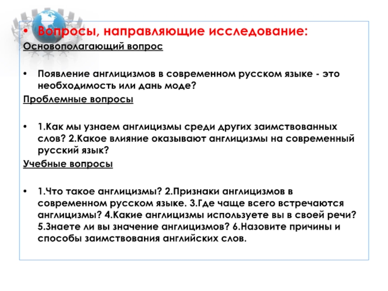 1.Что такое англицизмы? 2.Признаки англицизмов в современном русском языке. 3.Где чаще всего встречаются англицизмы? 4.Какие англицизмы используете вы в своей речи? 5.Знаете ли вы значение англицизмов? 6.Назовите причины и способы заимствования английских слов.
