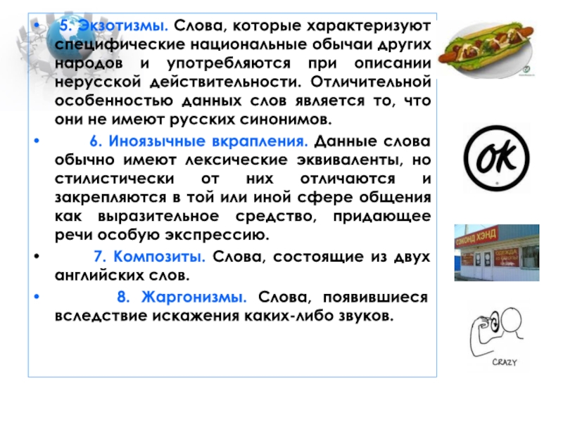 Слайд 7 5. Экзотизмы. Слова, которые характеризуют специфические национальные обычаи других народов