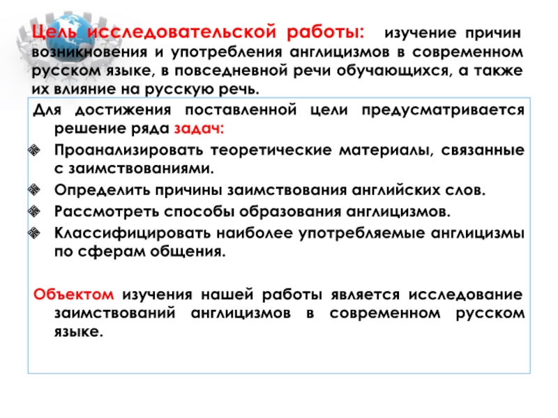 Слайд 2Цель исследовательской работы: изучение причин возникновения и употребления англицизмов в современном