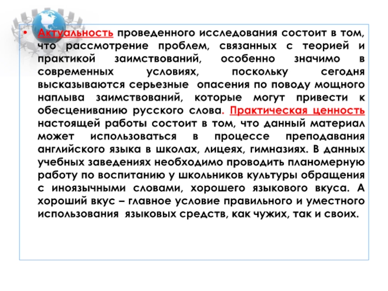 теорией и практикой заимствований, особенно значимо в современных условиях, поскольку сегодня высказываются серьезные опасения по поводу мощного наплыва заимствований, которые могут привести к обесцениванию русского слова. Практическая ценность настоящей работы состоит в том, что данный материал может использоваться в процессе преподавания английского языка в школах, лицеях, гимназиях. В данных учебных заведениях необходимо проводить планомерную работу по воспитанию у школьников культуры обращения с иноязычными словами, хорошего языкового вкуса. А хороший вкус – главное условие правильного и уместного использования языковых средств, как чужих, так и своих.