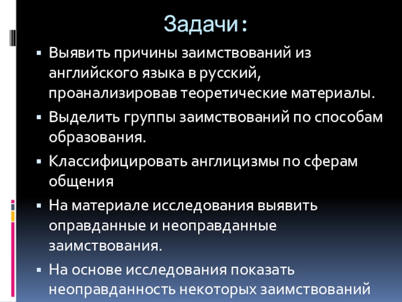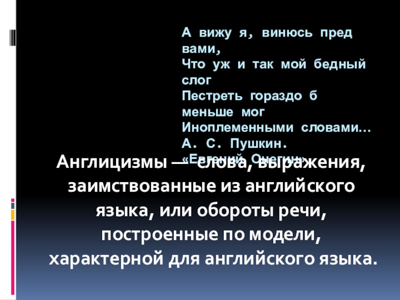 Англицизмы — слова, выражения, заимствованные из английского языка, или обороты речи, построенные по модели, характерной для английского языка.