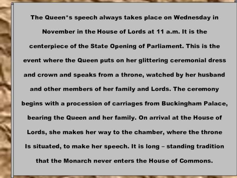 centerpiece of the State Opening of Parliament. This is the