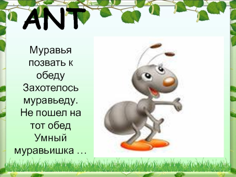 ANT Муравья позвать к обеду Захотелось муравьеду. Не пошел на тот обед Умный муравьишка …
