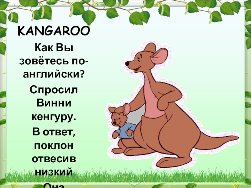 KANGAROOКак Вы зовётесь по-английски?Спросил Винни кенгуру.В ответ, поклон отвесив низкийОна сказала…