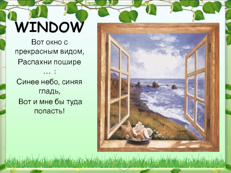WINDOWВот окно с прекрасным видом,Распахни пошире … :Синее небо, синяя гладь, Вот и мне бы туда попасть!