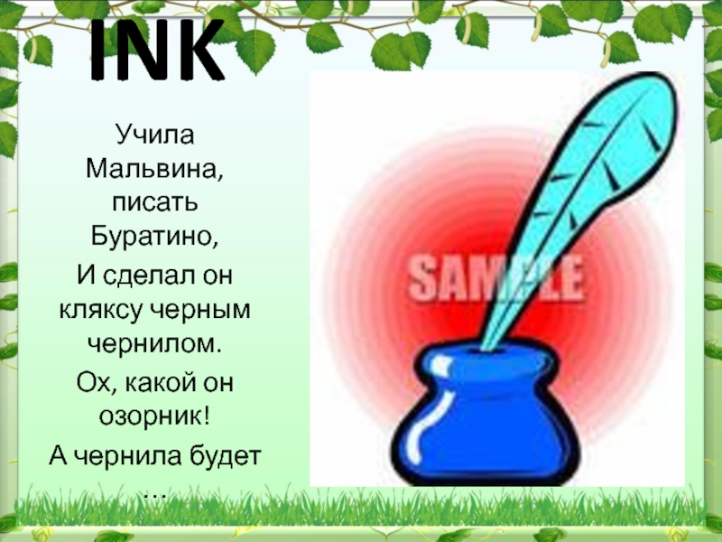 INKУчила Мальвина, писать Буратино, И сделал он кляксу черным чернилом.Ох, какой он озорник! А чернила будет …