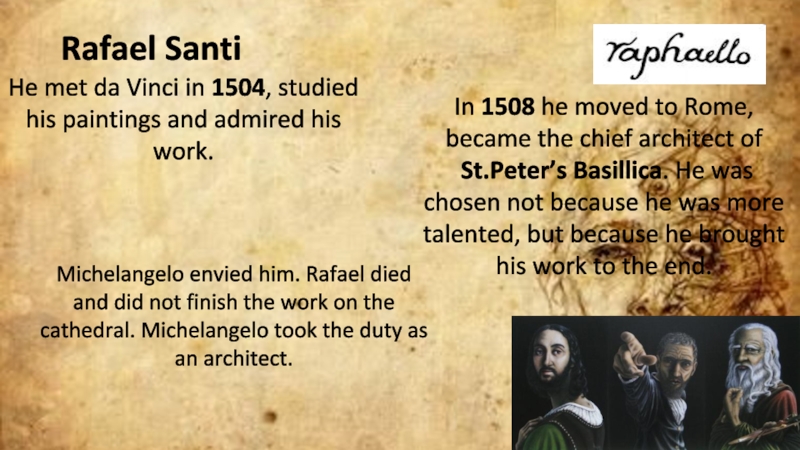 Michelangelo envied him. Rafael died and did not finish the work on the cathedral. Michelangelo took the duty as an architect.