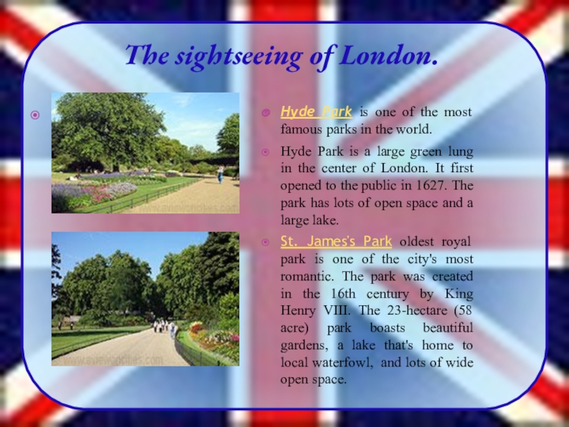 Hyde Park is a large green lung in the center of London. It first opened to the public in 1627. The park has lots of open space and a large lake.