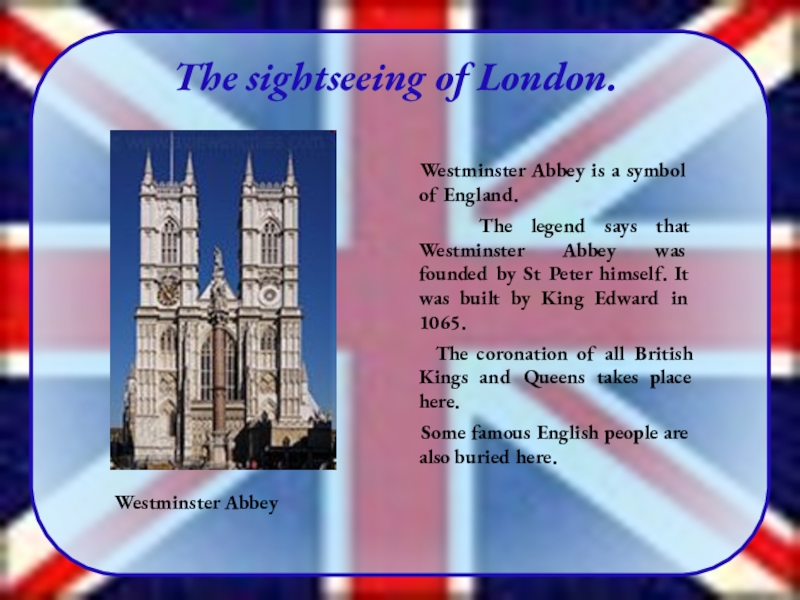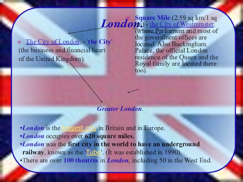 Square Mile (2.59 sq km/1 sq mi) - the City of Westminster. (where Parliament and most of the government offices are located. Also Buckingham Palace, the official London residence of the Queen and the Royal family are located there too).