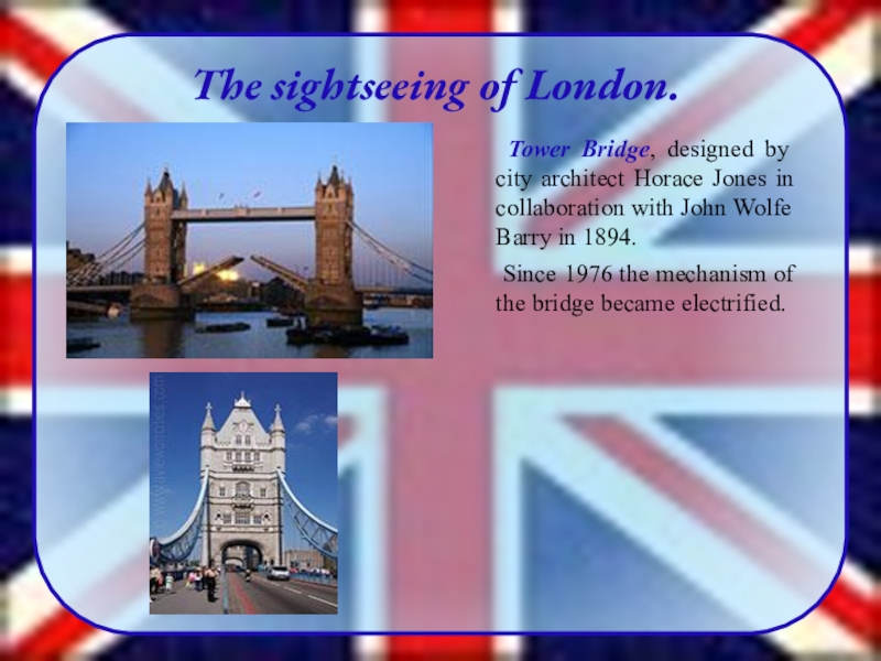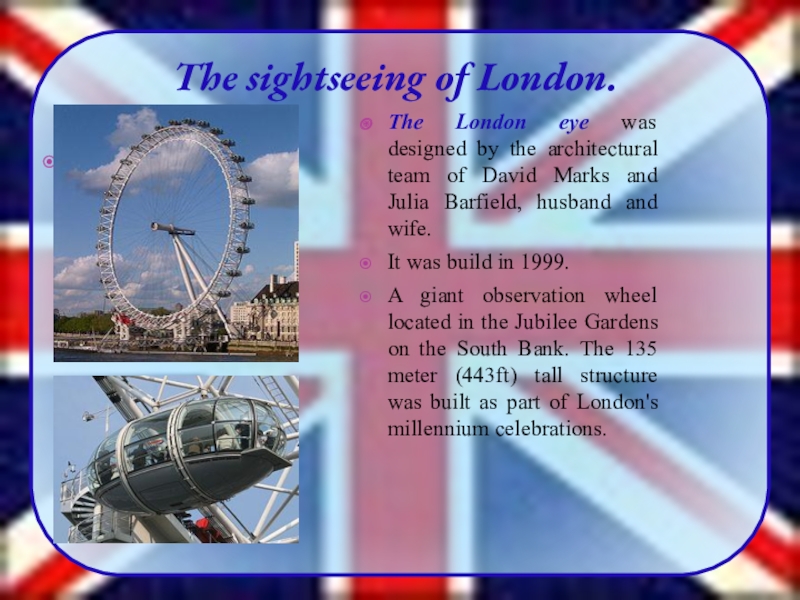 The London eye was designed by the architectural team of David Marks and Julia Barfield, husband and wife.