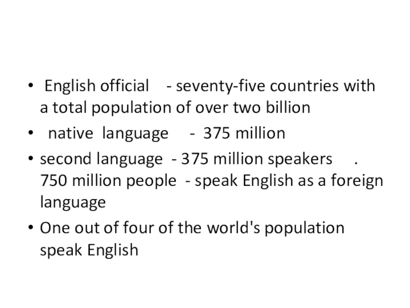 English official - seventy-five countries with a total population of over two billion native language - 375 million second language - 375 million speakers . 750 million