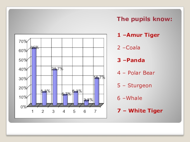 The pupils know: 1 –Amur Tiger2 –Coala3 –Panda4 – Polar Bear5 – Sturgeon6 –Whale7 – White Tiger