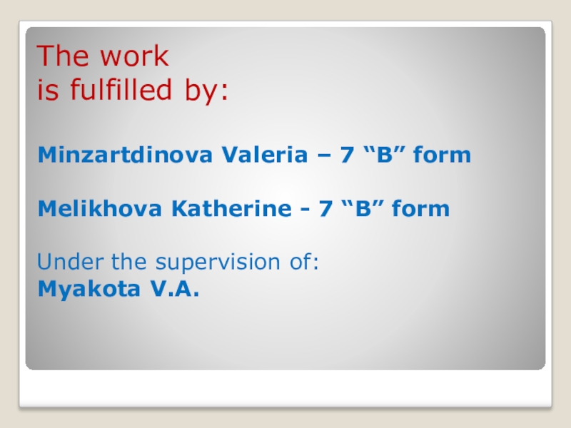 The work is fulfilled by: Minzartdinova Valeria – 7 “B” form Melikhova Katherine - 7 “B” form Under the supervision of: Myakota V.A.